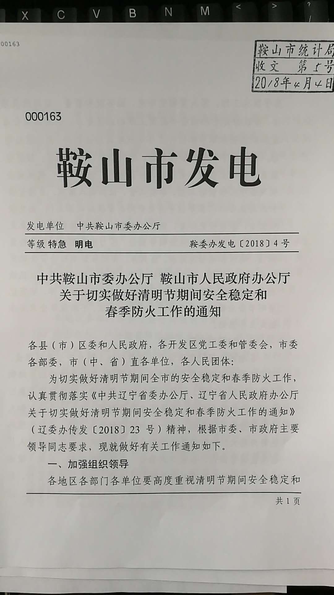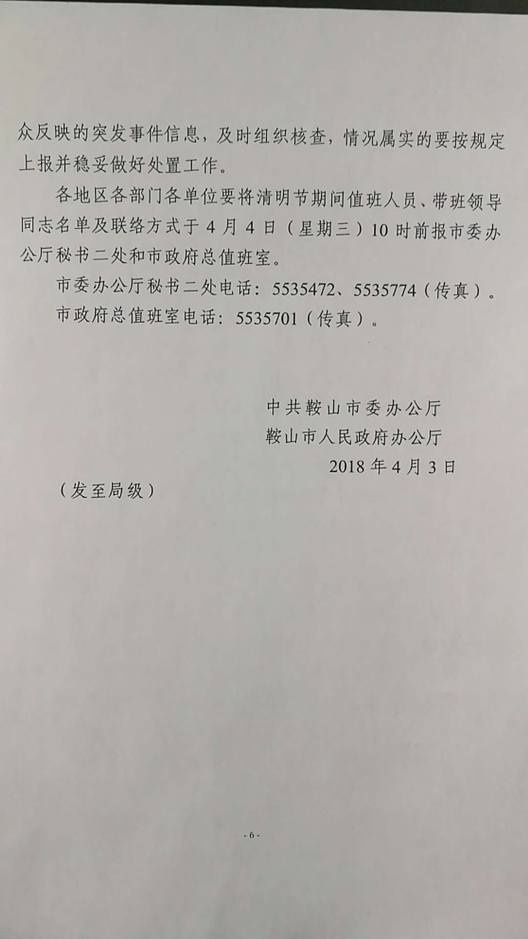 为切实做好清明期间全市的安全稳定和春季防火工作,现将《中共鞍山市委办公厅 鞍山市人民政府办公厅关于切实做好清明节期间安全稳定和春季防火工作的通知》( 鞍委办发电〔 2018 〕 4 号 )转发给你们,请组织认真学习并贯彻落实。